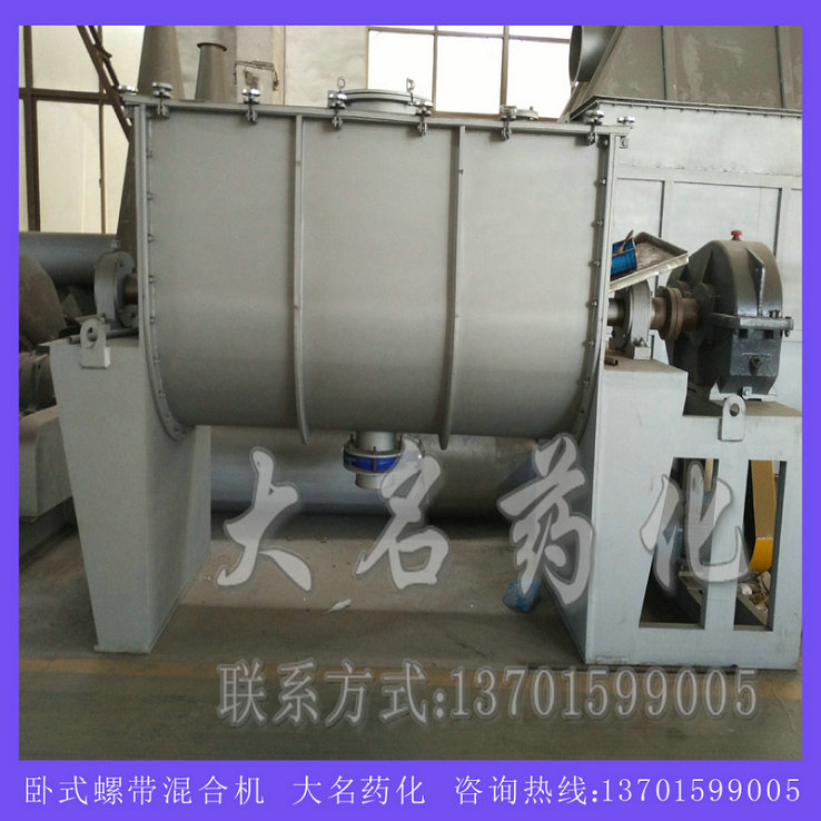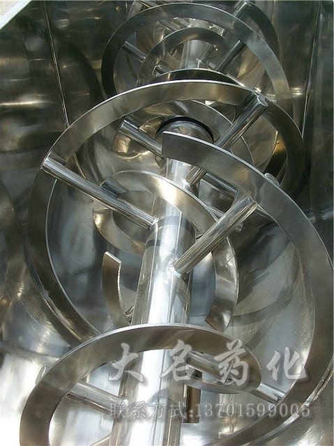 该机型由容器、螺旋搅拌叶片和传动部件组成:螺旋叶片一般做成双层或三层,外层螺旋将物料从两侧向中央汇集,内层螺旋将物料从中央两侧输送,形成对流混合。